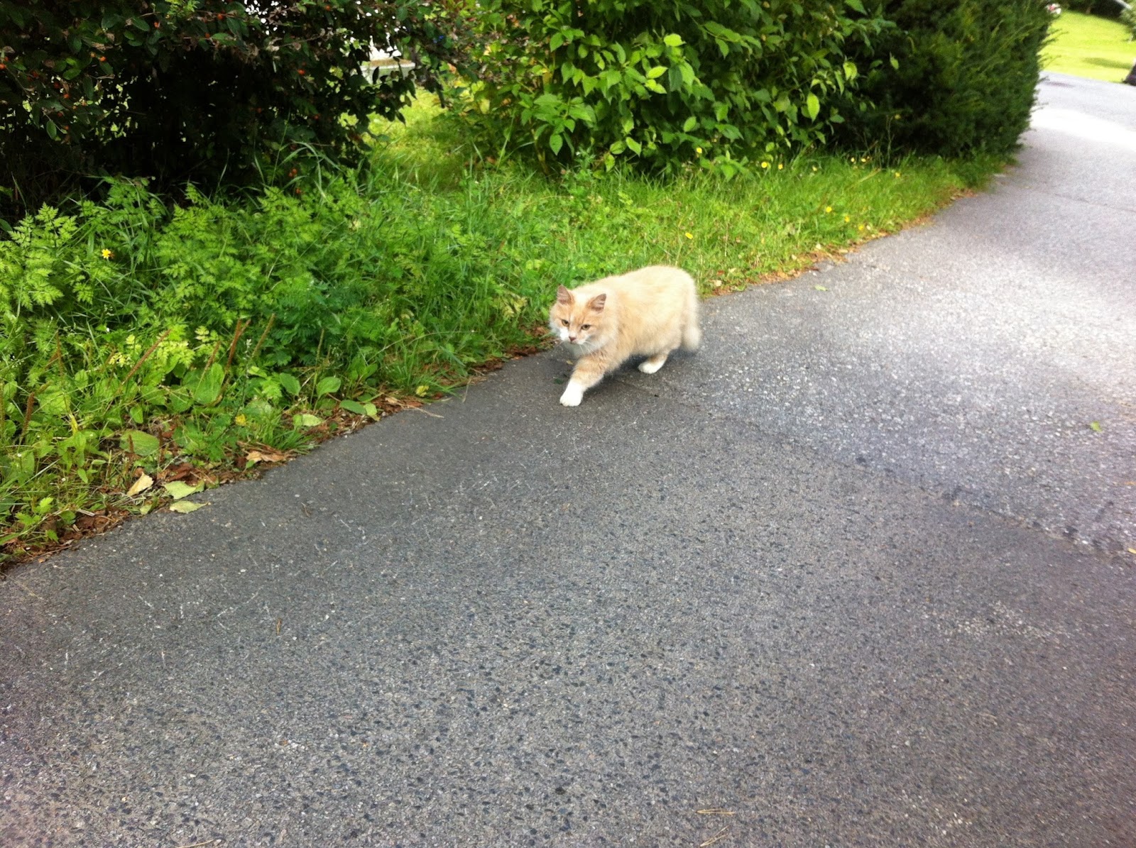 Jeg har vært litt pjuskete den siste uka, har spist lite, falt utfor verandaen tre meter ned, endte i buskene med pelsen revet av på den høyre forpoten, sovet mye, bare kost med matmor og matfar, ikke veket en tomme fra deres side. Savna dem veldig de tre dagene de var borte.